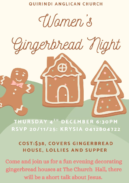 A fun evening decorating gingerbread houses & a short talk about Jesus. Kits are $38 each & you can pay at BSB: 062-594 & A/c no.: 28001832 (St Albans Anglican Church)